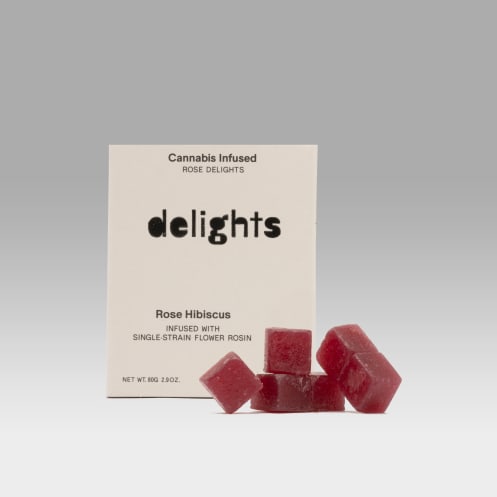 Rose Hibiscus: water, cane sugar, tapioca syrup, non-gmo potato starch, rosewater, hibiscus powder, mct coconut oil, non-gmo citric acid, cannabis flower rosin, kosher salt, Coating: tapioca starch, powdered sugar